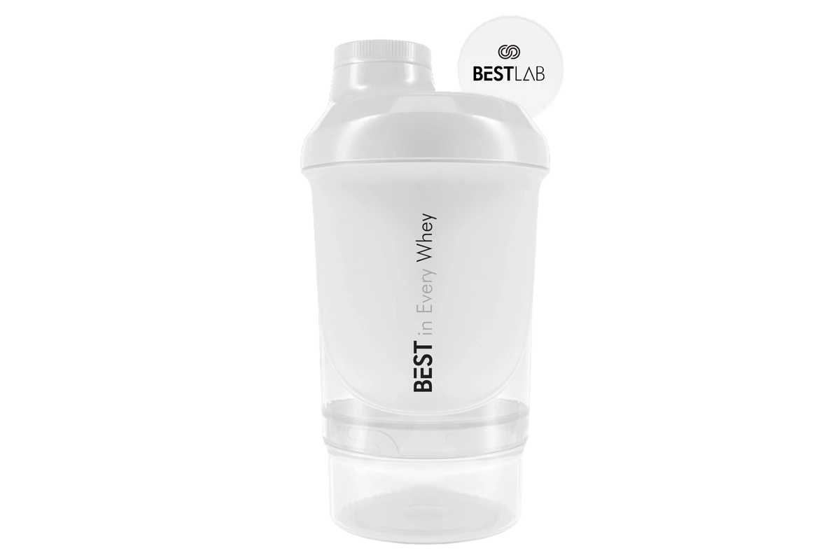 Shaker BestLab ma łączną pojemność 450 ml, co obejmuje główne naczynie o pojemności 300 ml oraz dodatkowy pojemnik 150 ml, który pomieści odżywki w proszku, kapsułki lub inne suplementy. Dzięki temu możesz wygodnie przygotować swój napój białkowy, przedtreningówkę czy kreatynę bez konieczności noszenia dodatkowych opakowań.Nowoczesny i trwały materiał